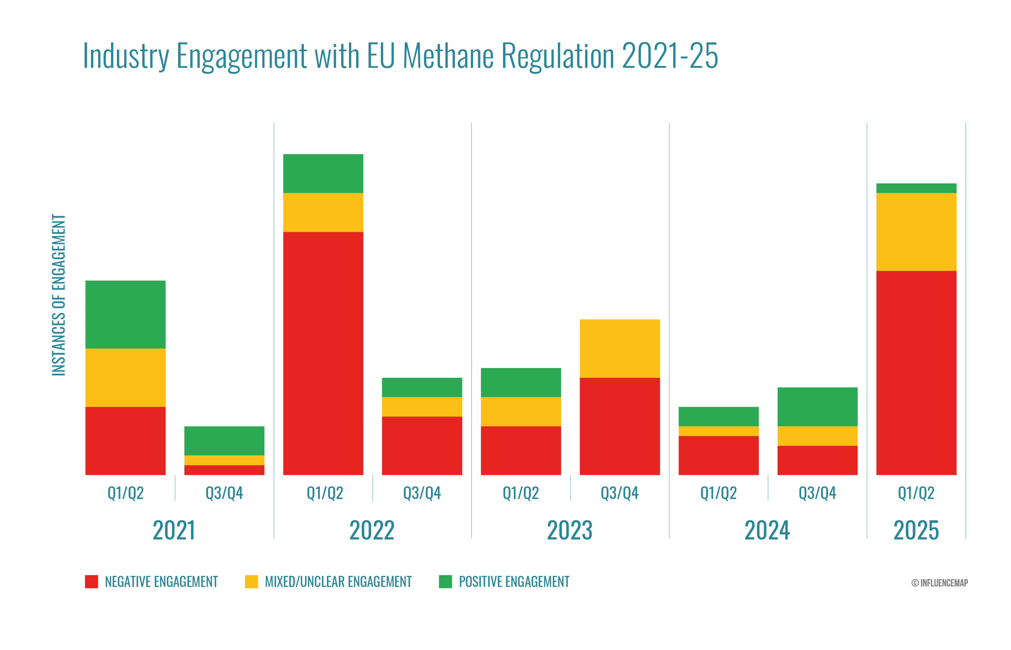 In 2025, InfluenceMap detected an uptick in industry advocacy against the file, coinciding with the EU strategy to phase out Russian fuel imports by 2027. Companies and industry associations are calling for less stringent measures, highlighting the regulation’s consequences for importers and pushing the narrative that this consequently poses a risk to the EU’s energy security. The graphic below illustrates all industry engagement with the policy identified by the LobbyMap database since its proposal. The spike in negative advocacy in 2025 is comparable to levels of engagement during the initial consultation period in February–May 2021 and during the feedback period from December 2021–April 2022.